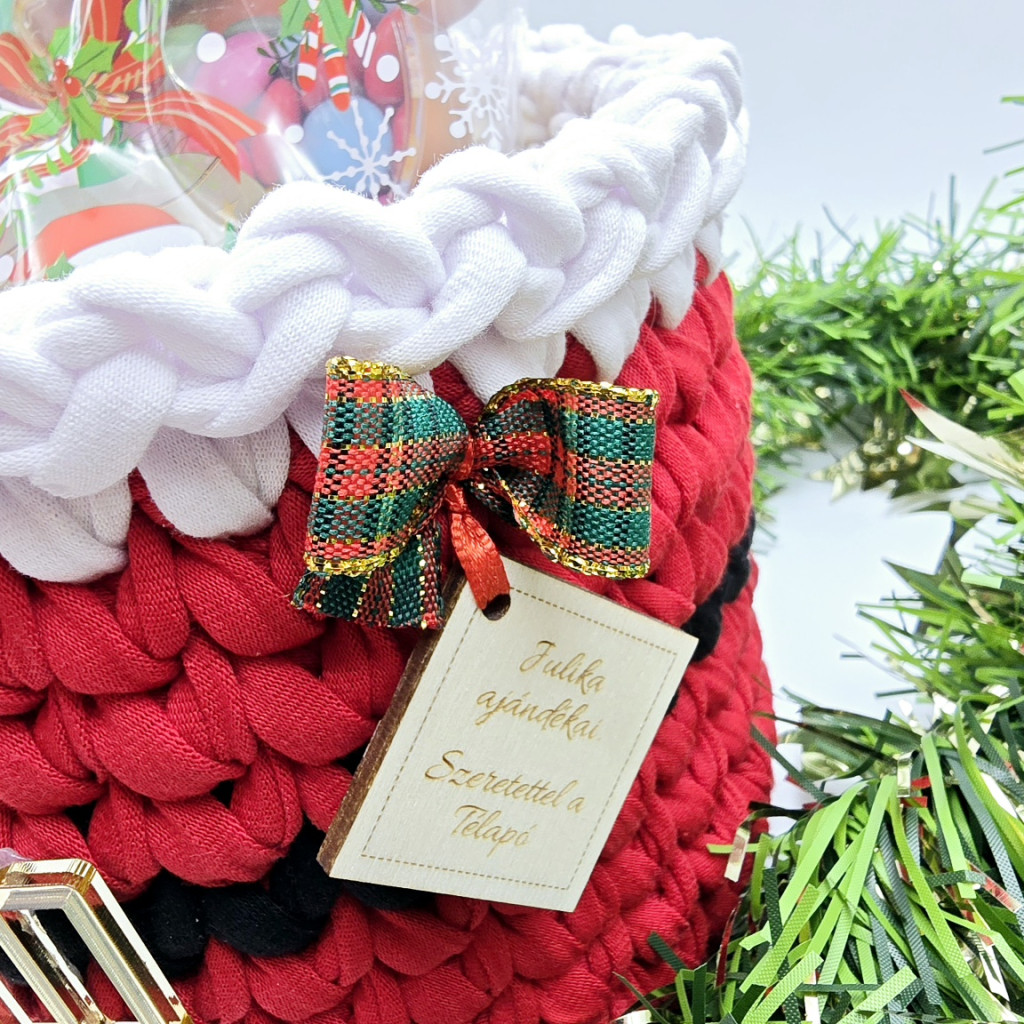 Horgolt Mikulás tárolókosár gravírozott bilétával – egyedi, stílusos szaloncukortartó, amely ajándékcsomagnak is tökéletes!