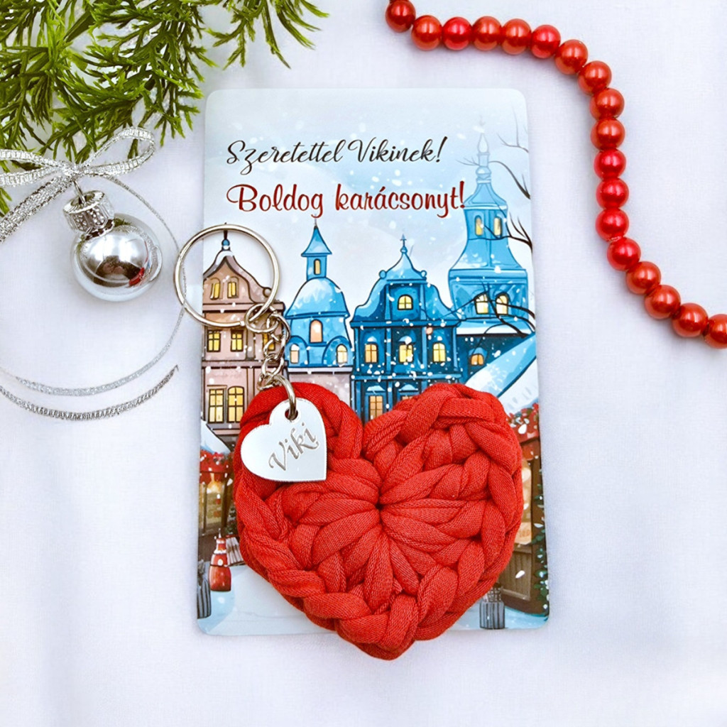 Horgolt szív kulcstartó gravírozható medállal és egyedi karácsonyi ajándékkártyával. Választható színekben, személyre szabható ünnepi meglepetés.
