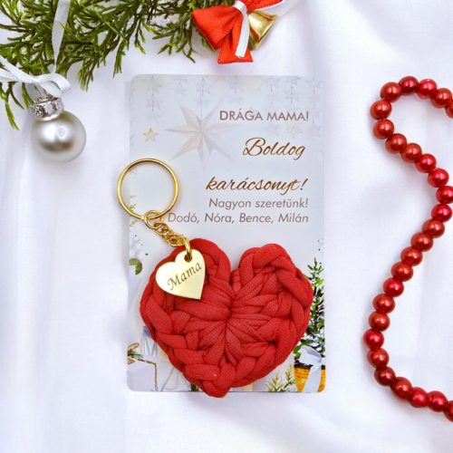 Horgolt szív kulcstartó gravírozható medállal és egyedi karácsonyi ajándékkártyával. Választható színekben, személyre szabható ünnepi meglepetés.