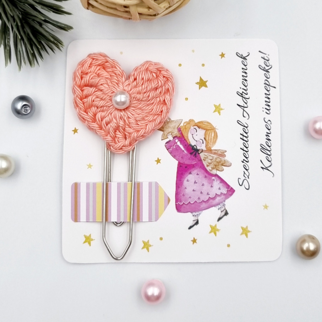 Horgolt szíves könyvjelző óriás gémkapocson, karácsonyi ajándékkártyán. Több színben választható, kézzel készült apró ajándék karácsonyra.