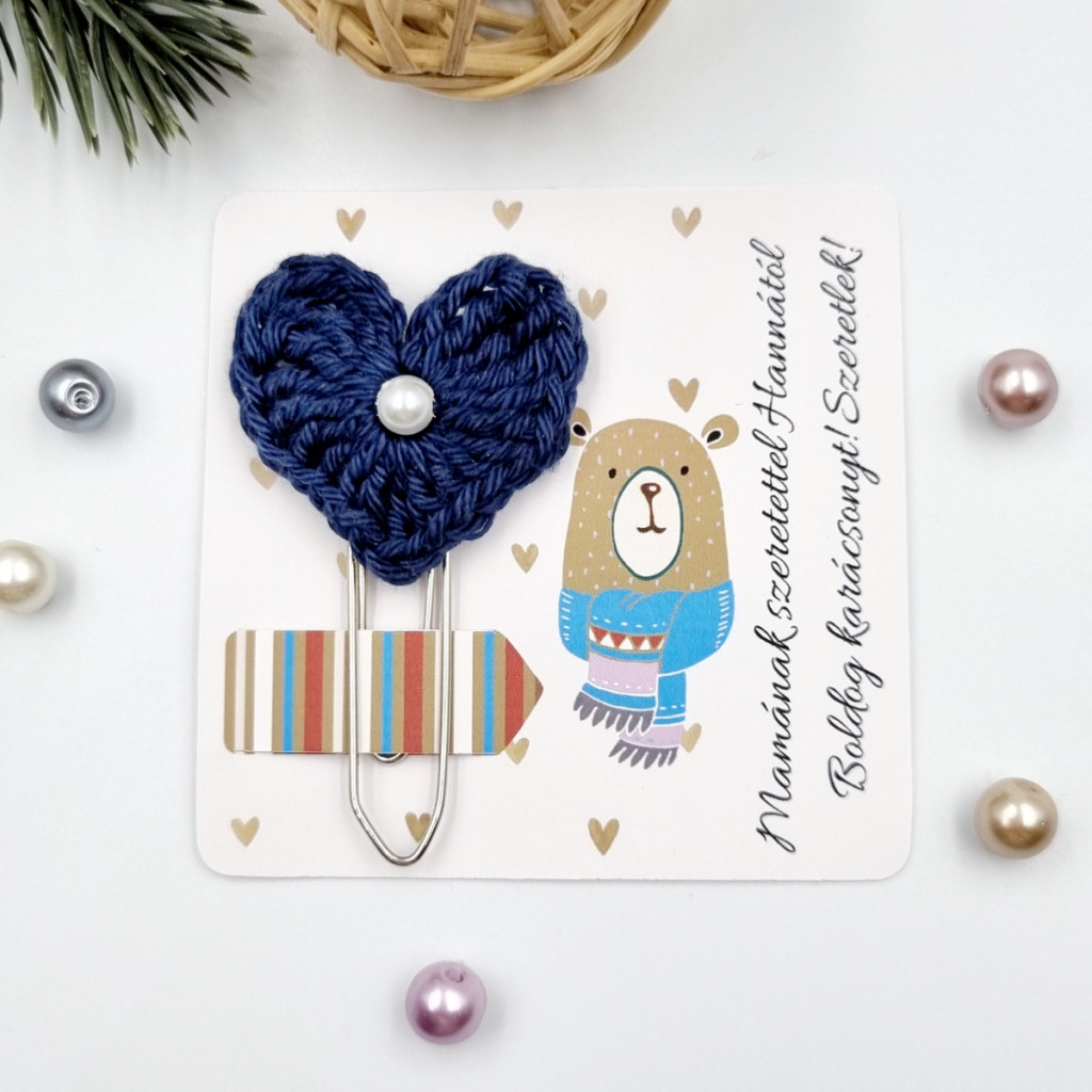 Horgolt szíves könyvjelző óriás gémkapocson, karácsonyi ajándékkártyán. Több színben választható, kézzel készült apró ajándék karácsonyra.