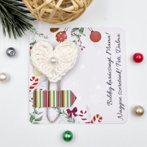 Horgolt szíves könyvjelző óriás gémkapocson, karácsonyi ajándékkártyán. Több színben választható, kézzel készült apró ajándék karácsonyra.