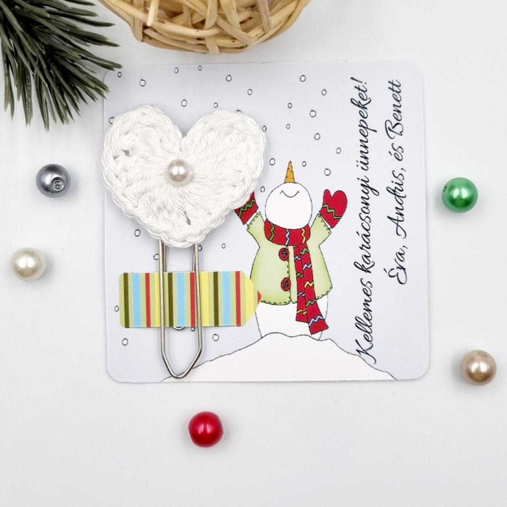 Horgolt szíves könyvjelző óriás gémkapocson, karácsonyi ajándékkártyán. Több színben választható, kézzel készült apró ajándék karácsonyra.