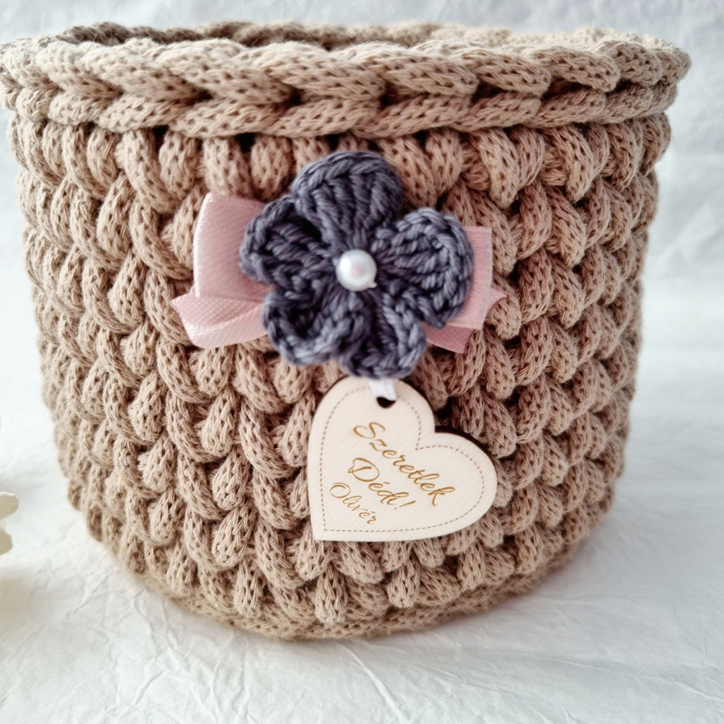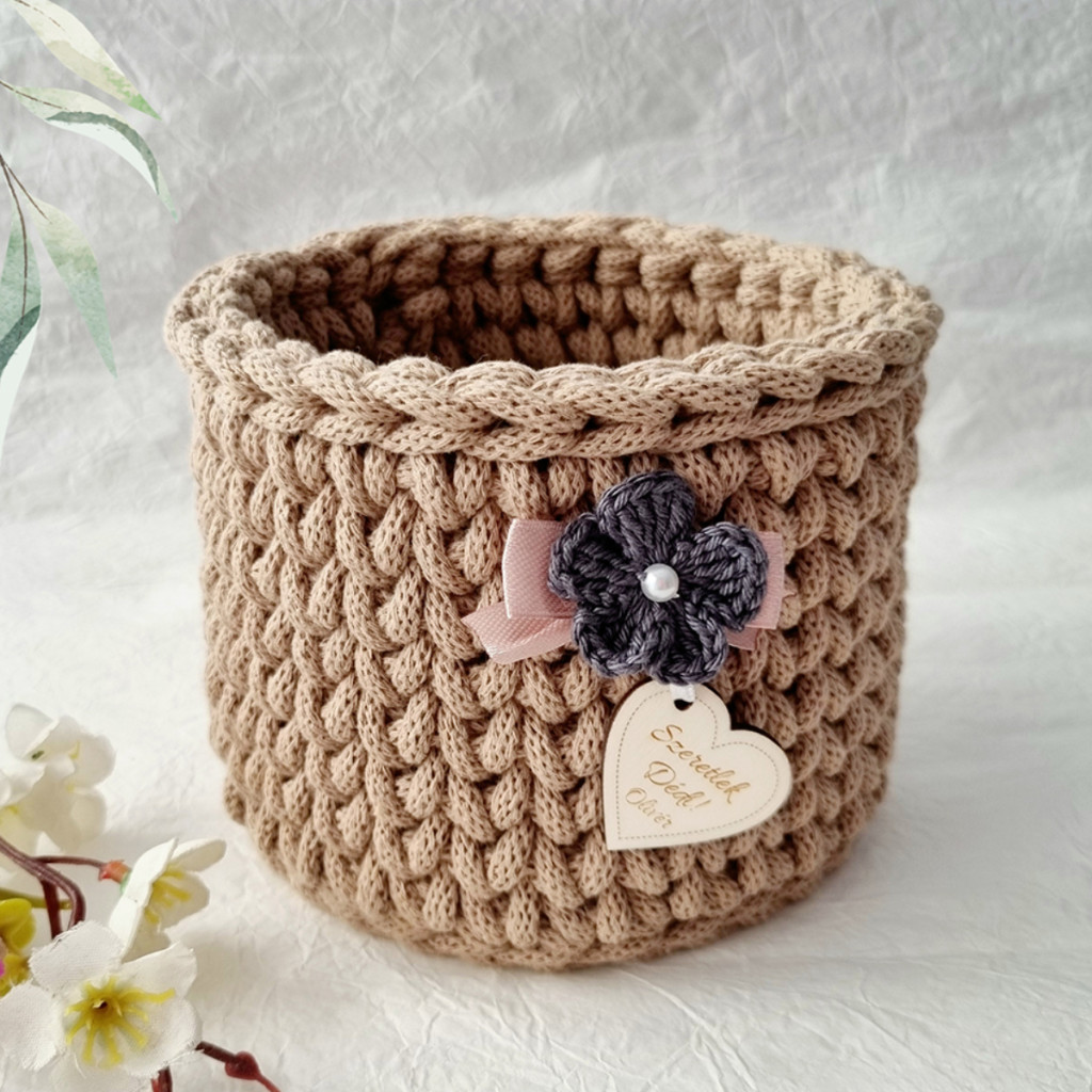 Horgolt tárolókosár gravírozott bilétával – egyedi ajándék tejeskávé színben!