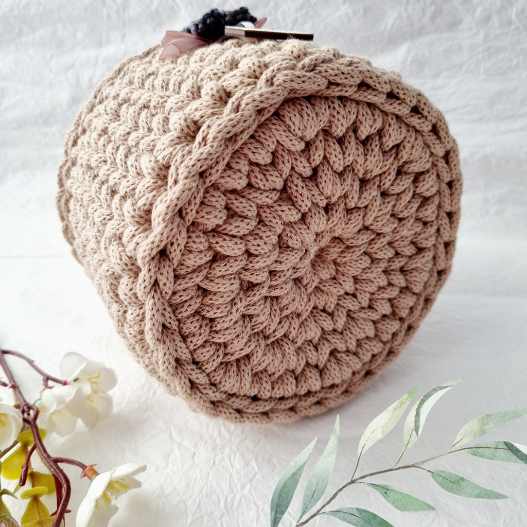 Kézzel horgolt, kézműves tárolókosár minőségi zsinórfonalból. A kosár alja is horgolt, egységes és stabil kialakítású.