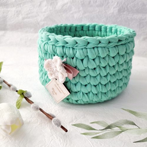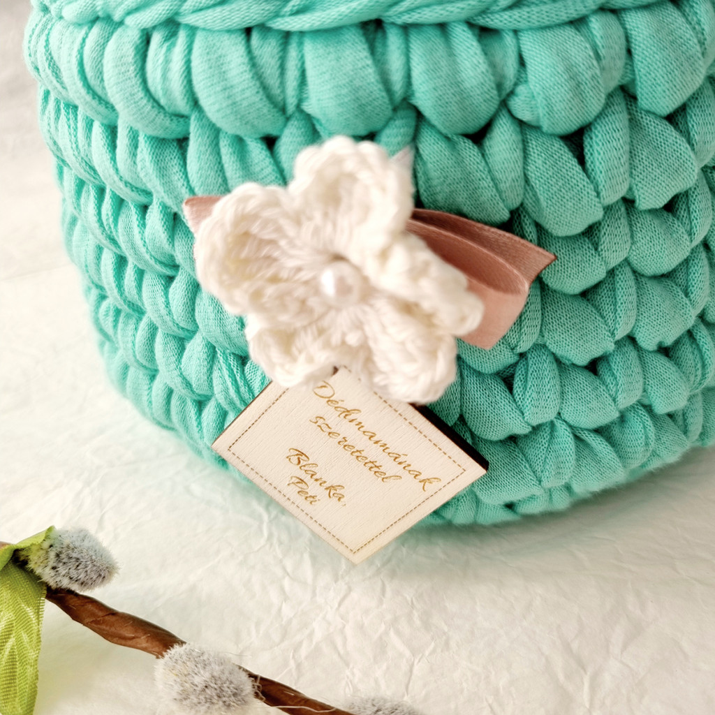 Horgolt tárolókosár gravírozott bilétával – tökéletes ajándék családi és óvodai eseményekre menta színben!