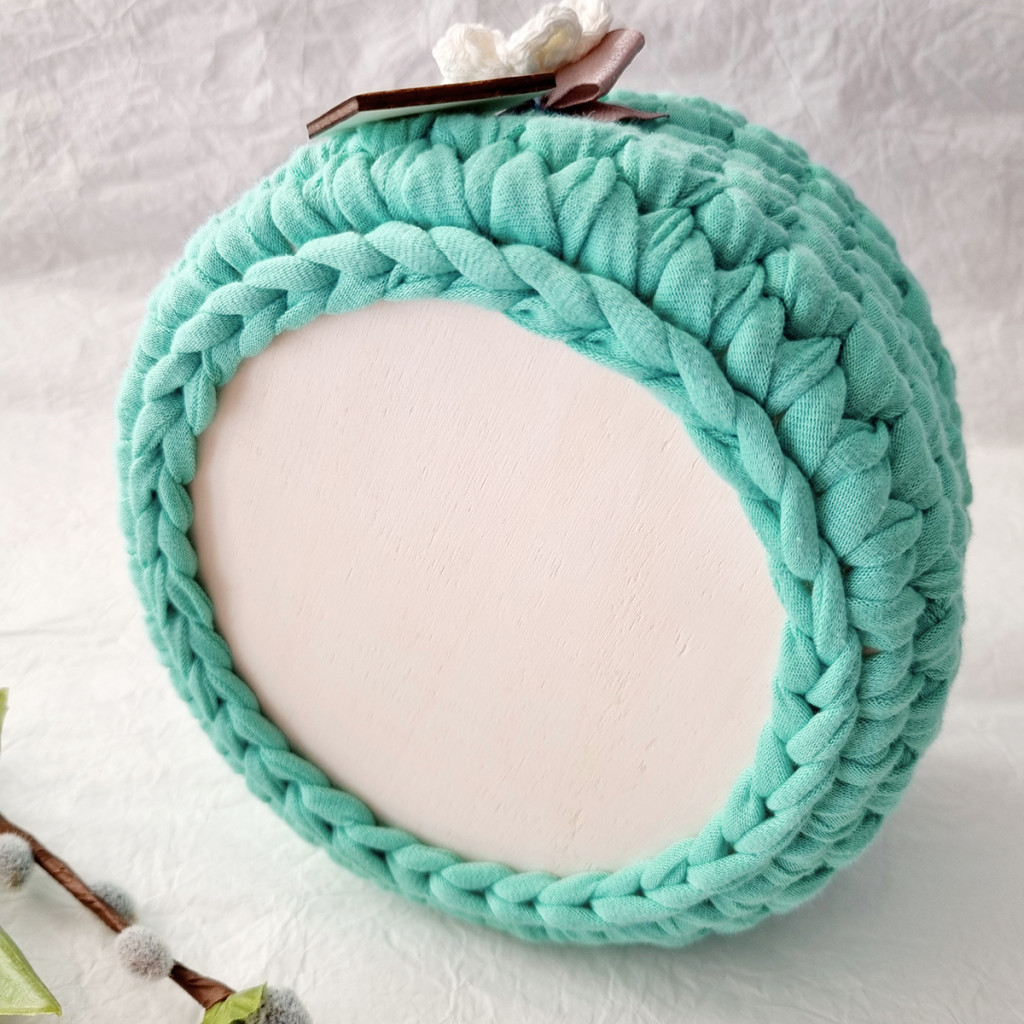 Ez a menta színű, elegáns horgolt tárolókosár gravírozott bilétával és választható virágdíszítéssel tökéletes ajándék családi és óvodai eseményekre, valamint praktikus dekorációként is megállja a helyét.
