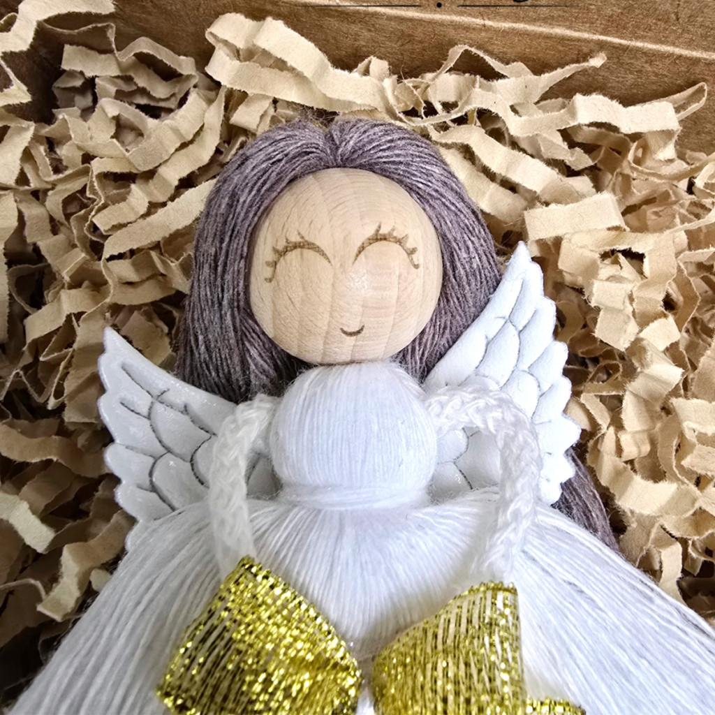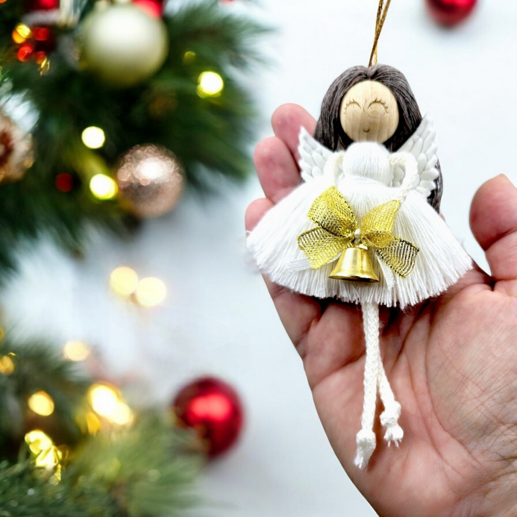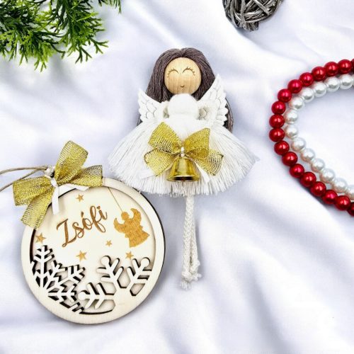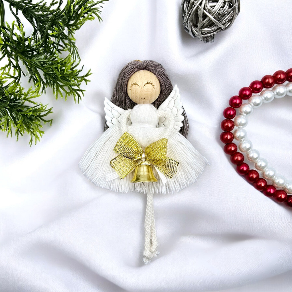 • Makramé angyalka: kb. 12 cm magas, fehér fonalból készül, barna hajú, arany csengettyűt tart a kezében, és fehér szárnyakkal díszített.