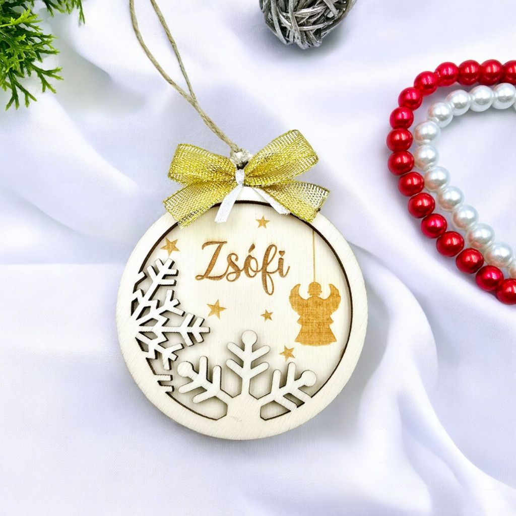 • Gravírozott fa karácsonyfadísz: kb. 7 cm átmérőjű kör alakú dísz, egyedi névvel vagy rövid szöveggel kérhető, az angyalkához illő szalaggal és akasztóval szállítva.