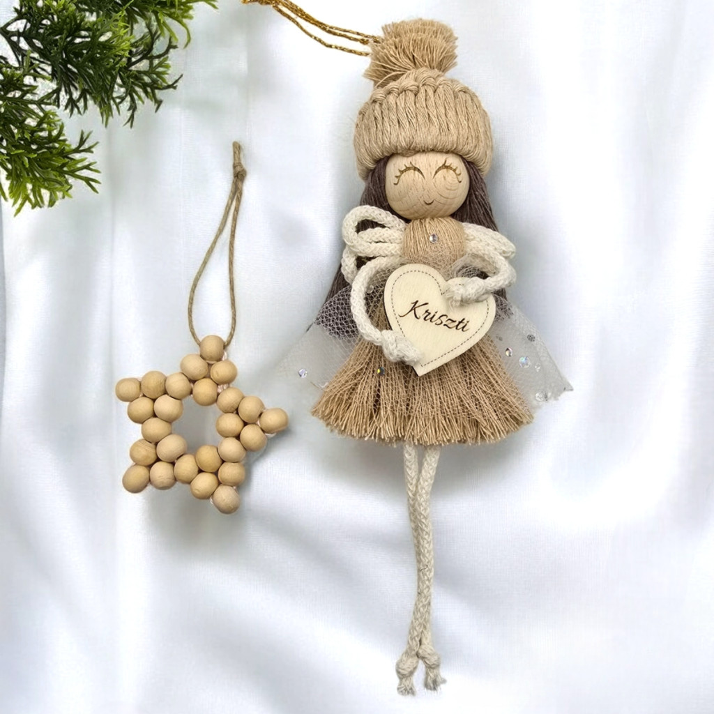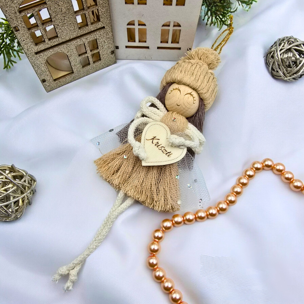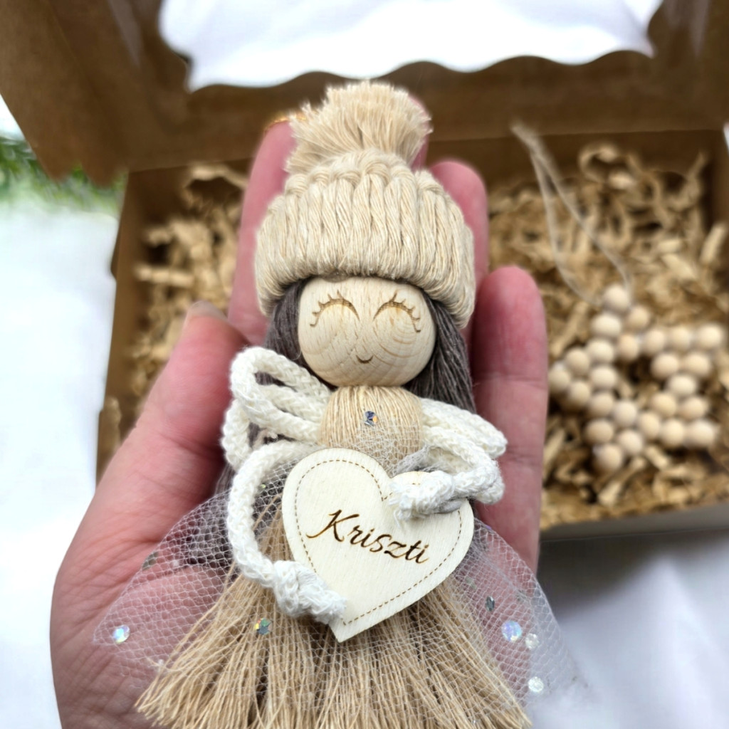 • 1 db makramé angyalka (kb. 15 cm, bézs ruha, barna haj, gravírozható szívvel)