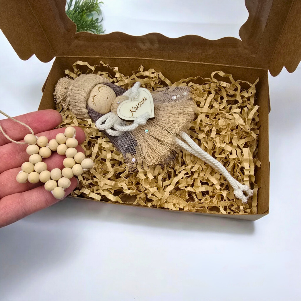 Karácsonyi ajándékszett makramé angyalkával és fagyöngy díszszel. Az angyalka kezében gravírozható szívvel személyre szabható, igényes dobozban szállítva.