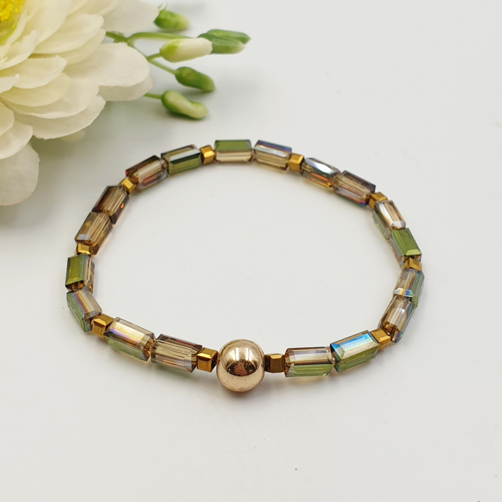 Ez az elegáns karkötő ötvözi a csiszolt üveggyöngyök ragyogását és az arany színű hematit különleges fényét, hogy igazán stílusos és figyelemfelkeltő ékszer legyen.