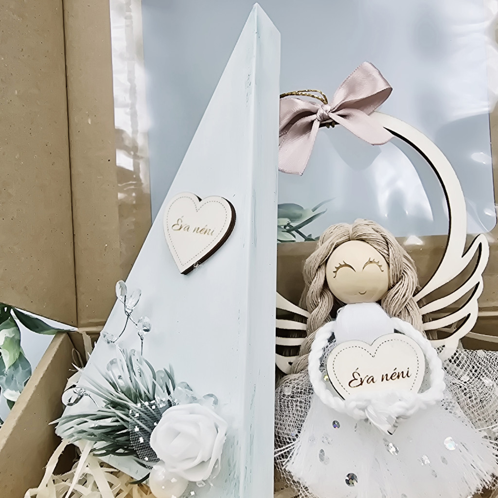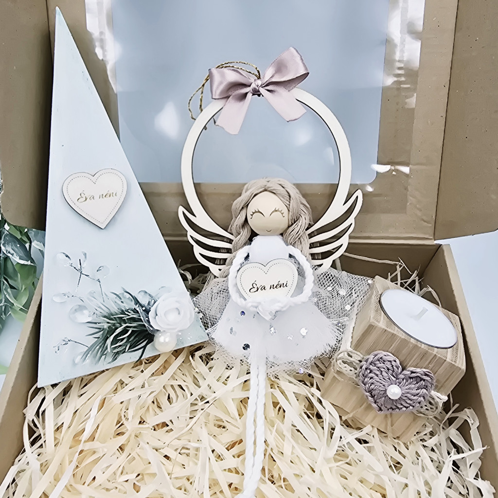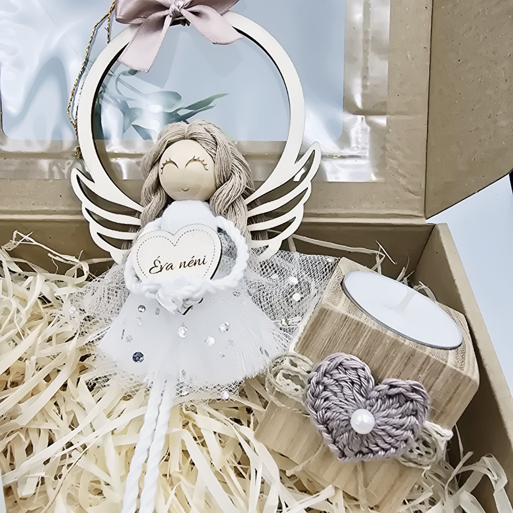 A makramé angyalka fehér ruhás, szőke hajú, tüllszoknyás kivitelben készült. Kezében gravírozott szívet tart, amelyre szintén név vagy rövid üzenet kérhető. A 9 cm átmérőjű fa karikával bárhová felakasztható, kedves dísze lehet bármely otthonnak.