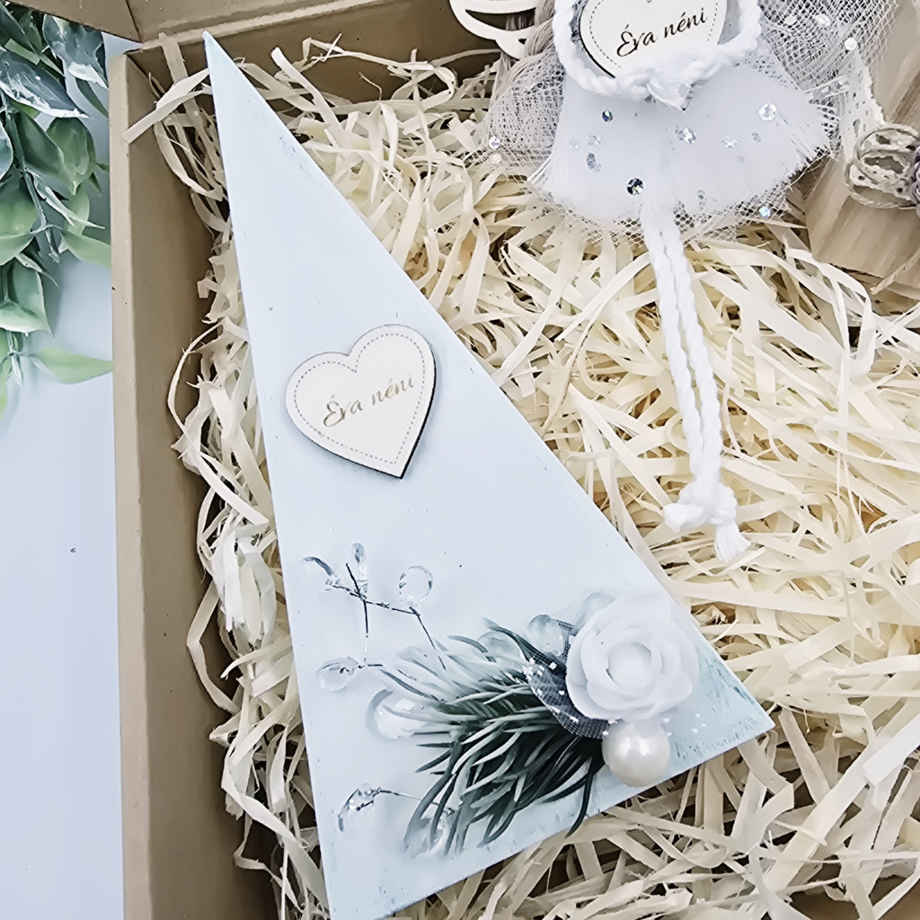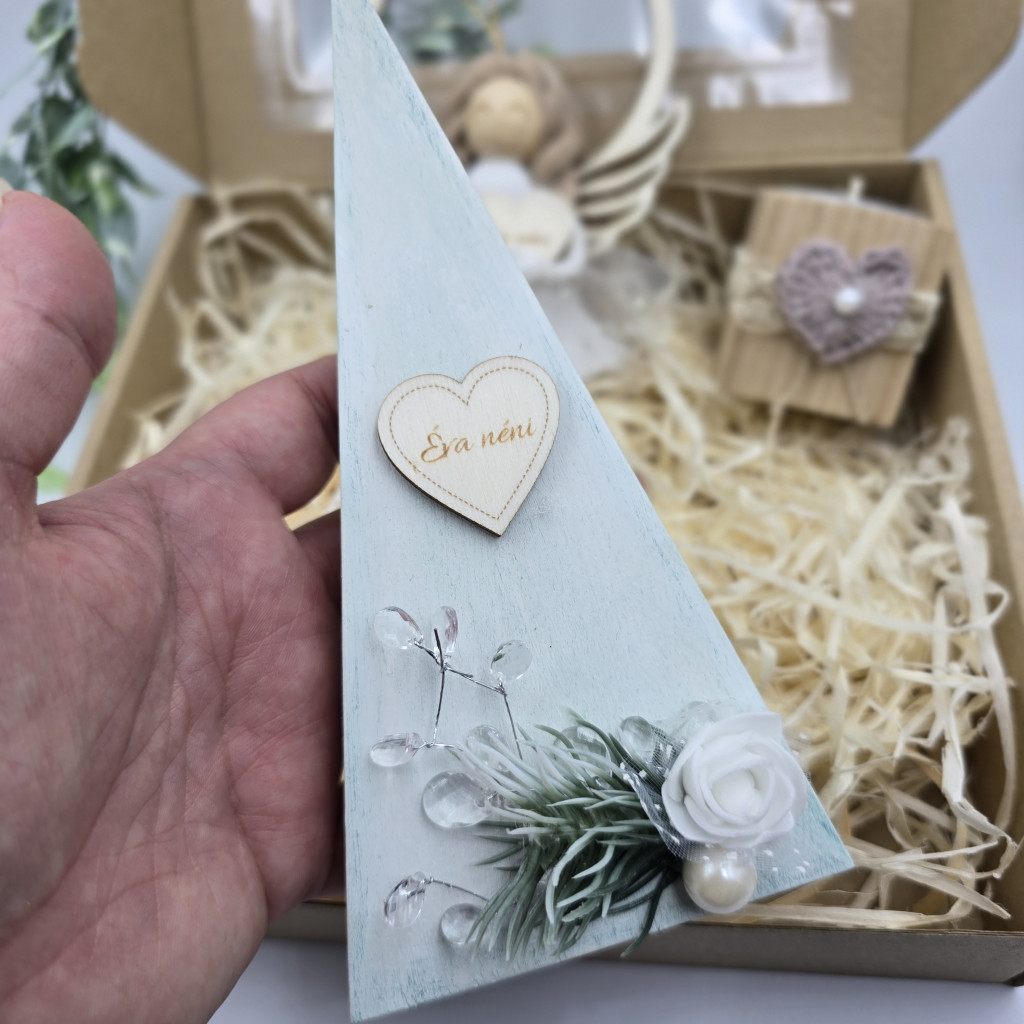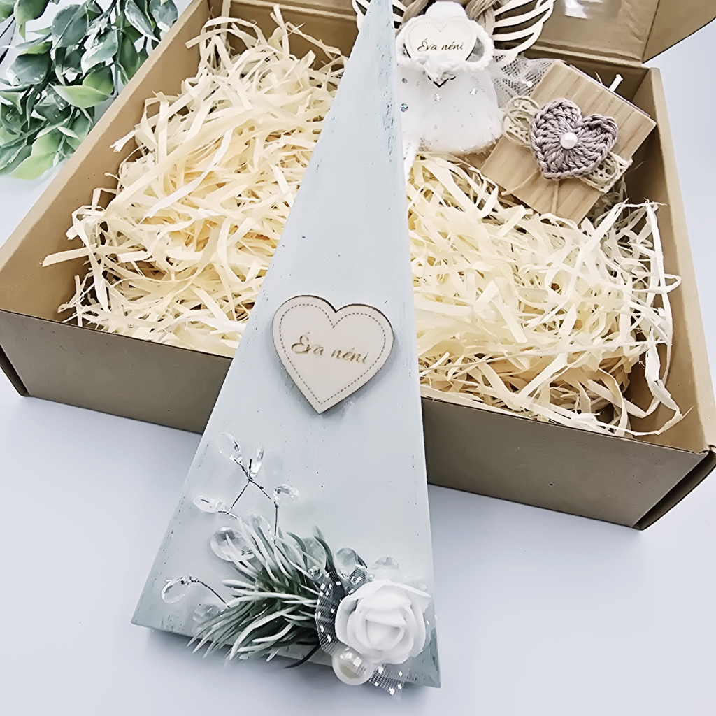 Természetes, kézműves hangulatú karácsonyi ajándékdoboz, amely három egyedi darabot tartalmaz.