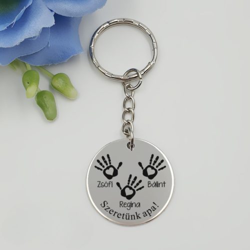 Személyre szabott "Kis tenyerem" kulcstartó, amely a képen látható három tenyérlenyomat mintával készül. Egyedi nevek és alsó ívelt felirat gravírozható, tökéletes emlék szülőknek és nagyszülőknek.