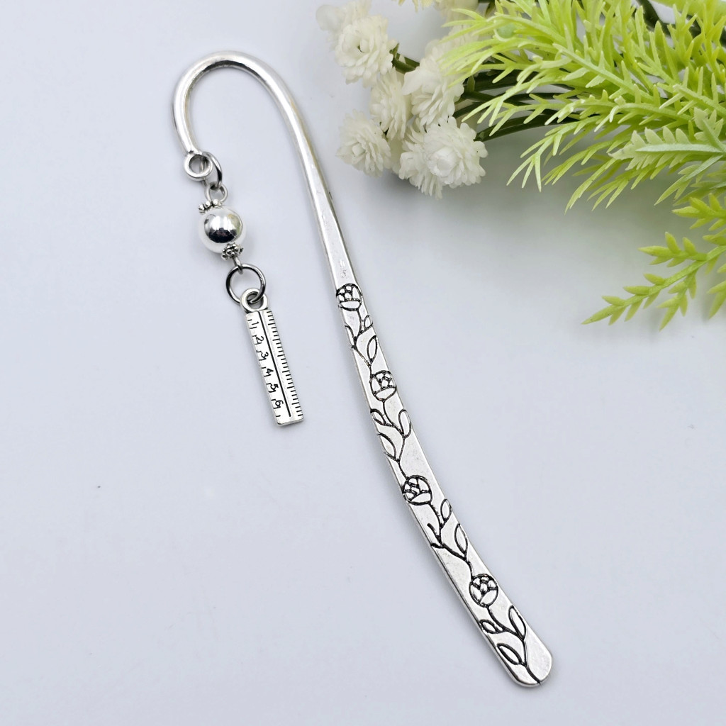 Elegáns virágmintás, ötvözetből készült könyvjelző vonalzó charm díszítéssel, tökéletes ajándék matematikatanároknak és minden pedagógusnak ballagásra, pedagógusnapra, vagy tanév végi ajándékként.