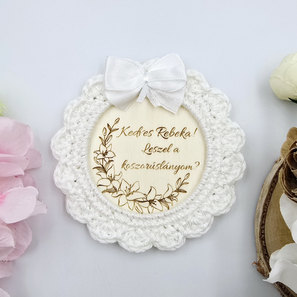 Egy koszorúslány felkérés nem csupán egy kérdés, hanem egy közös emlék kezdete. Ha szeretnéd ezt a pillanatot különlegessé tenni, ez a horgolt, gravírozott hűtőmágnes igazán személyes választás.