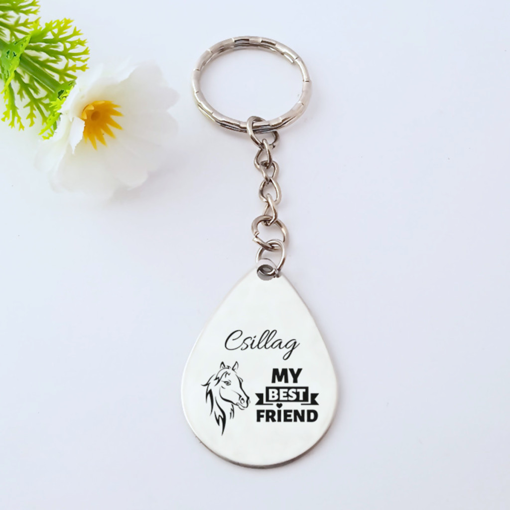 Személyre szabott kulcstartó My Best Friend felirattal és ló mintával, a te lovad nevével gravírozva. Egyedi ajándék lovasoknak, tartós nemesacél csepp alakú medállal.