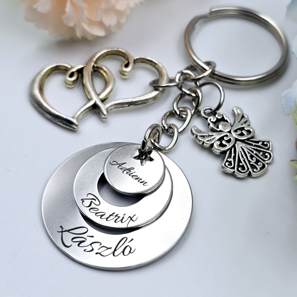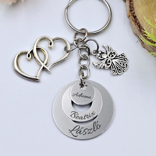 Gravírozott kulcstartó három nemesacél karika medállal és két charmmal (angyal, dupla szív). Egyedi ajándék szeretettel és meghitt üzenettel, különleges alkalmakra!