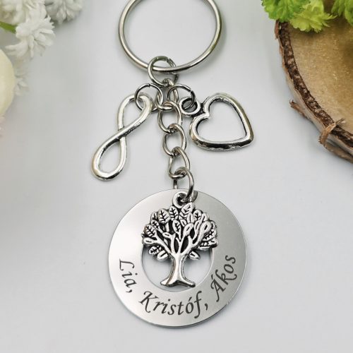 Gravírozott kulcstartó egy nemesacél karika medállal és három charmmal (végtelen, életfa, szív). Egyedi ajándék szeretteidnek, amely az örök szeretet és az összetartozás jelképe.