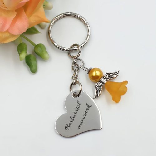 Egyedi gravírozott kulcstartó narancssárga akril angyalkával és nemesacél szív medállal. Személyre szabható felirattal, választható betűtípussal és opcionális charmokkal – tökéletes ajándék anyák napjára!