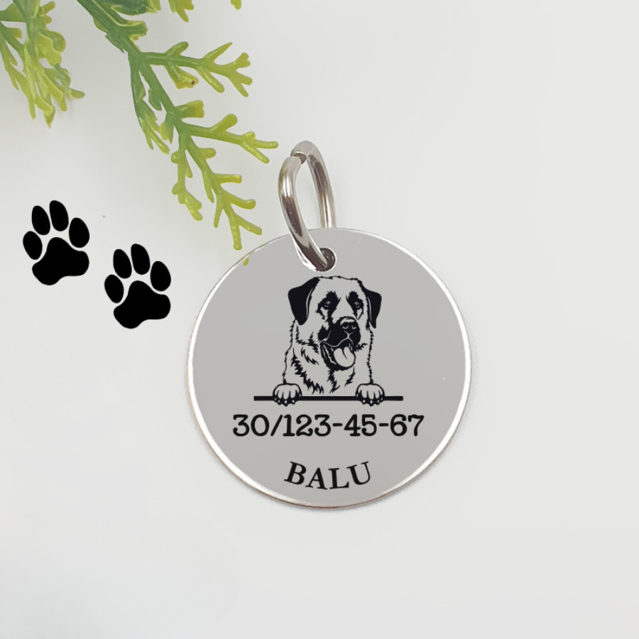 Egyedi kutyabiléta kangal kutyáknak. 2 vagy 3 cm-es méretben kérhető, a képen látható grafikával,  a te kutyád nevével, és az általad megadott telefonszámmal.