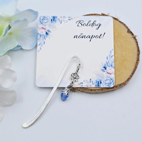 Mini könyvjelző kék csiszolt csepp üveggyönggyel nőnapi ajándékkártyával