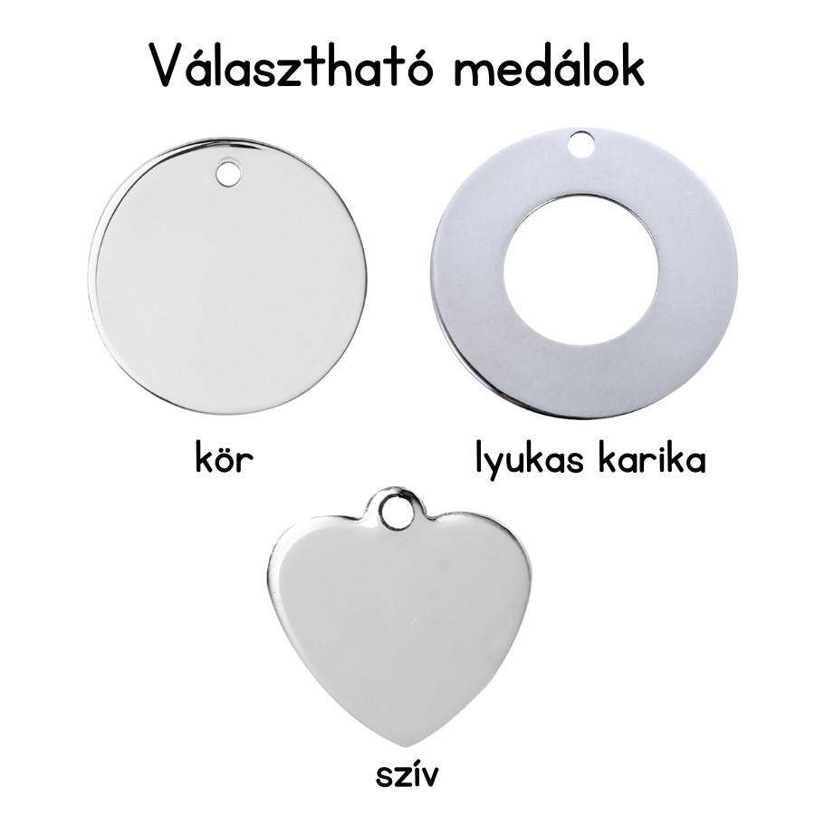 A termék tartalmaz 1 db 2 cm-es gravírozott nemesacél főmedált, amelyet egyedi felirattal láthatsz el.