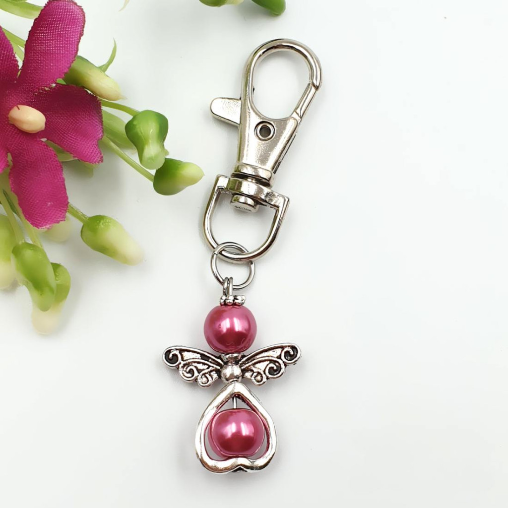 Elegáns pink teklagyöngy angyalkás kulcstartó, karabíneres kulcstartóalappal. Kifinomult ajándék minden alkalomra, amely könnyedén rögzíthető kulcsra, táskára vagy pénztárcára.