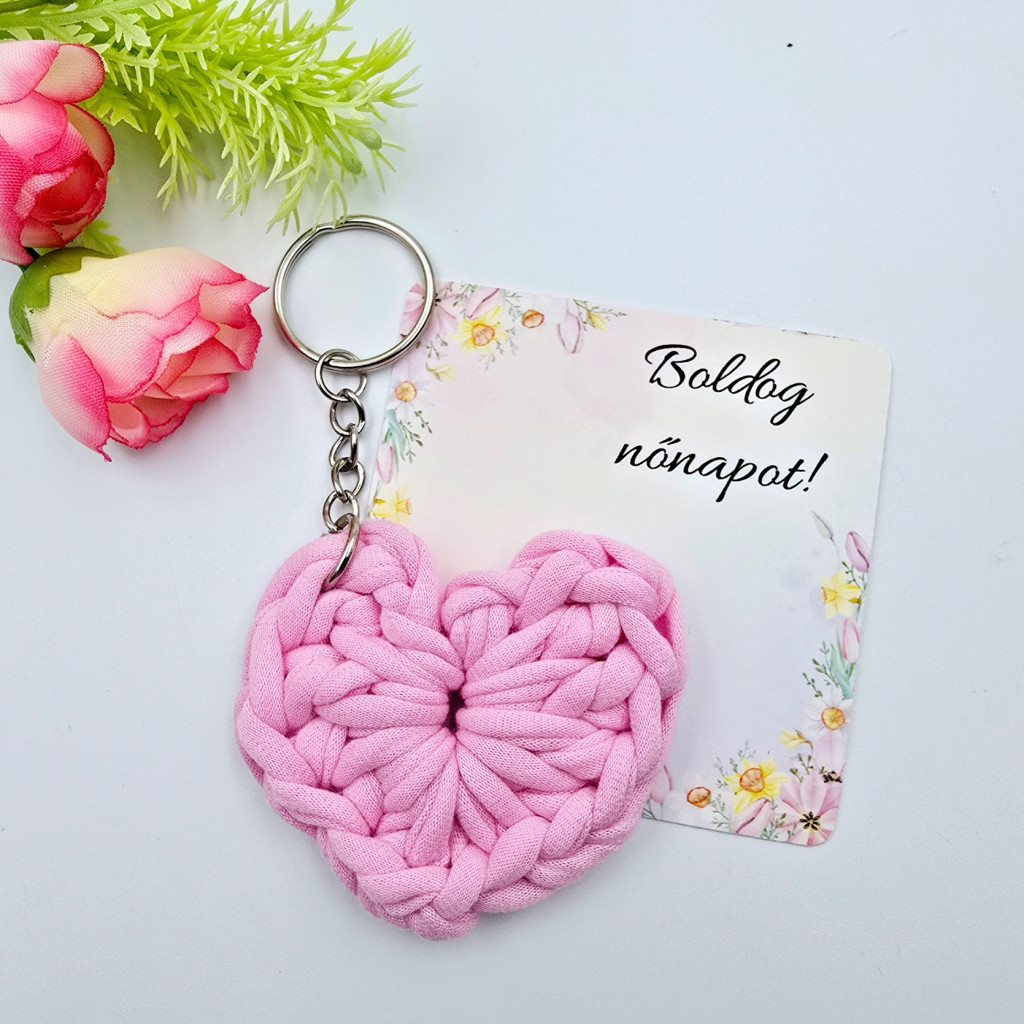 Nőnapi ajándék rózsaszín horgolt szív kulcstartó ajándékkártyával