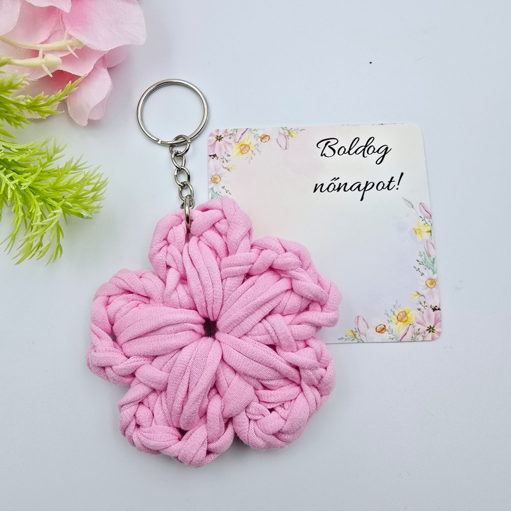 Nőnapi ajándék, rózsaszín horgolt virág kulcstartó ajándékkártyával