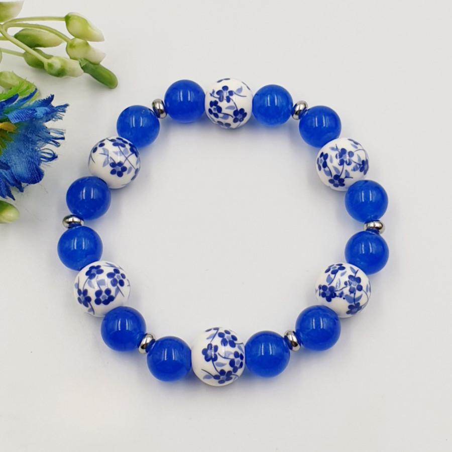 "Sophia" - ásvány karkötő kék jáde kővel, és virágmintás porcelán gyöngyökkel