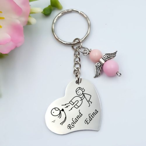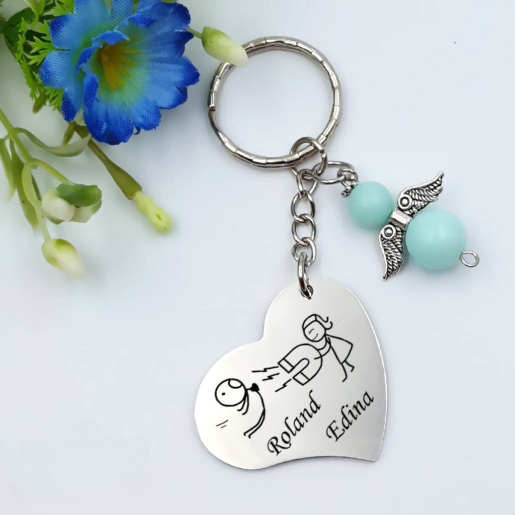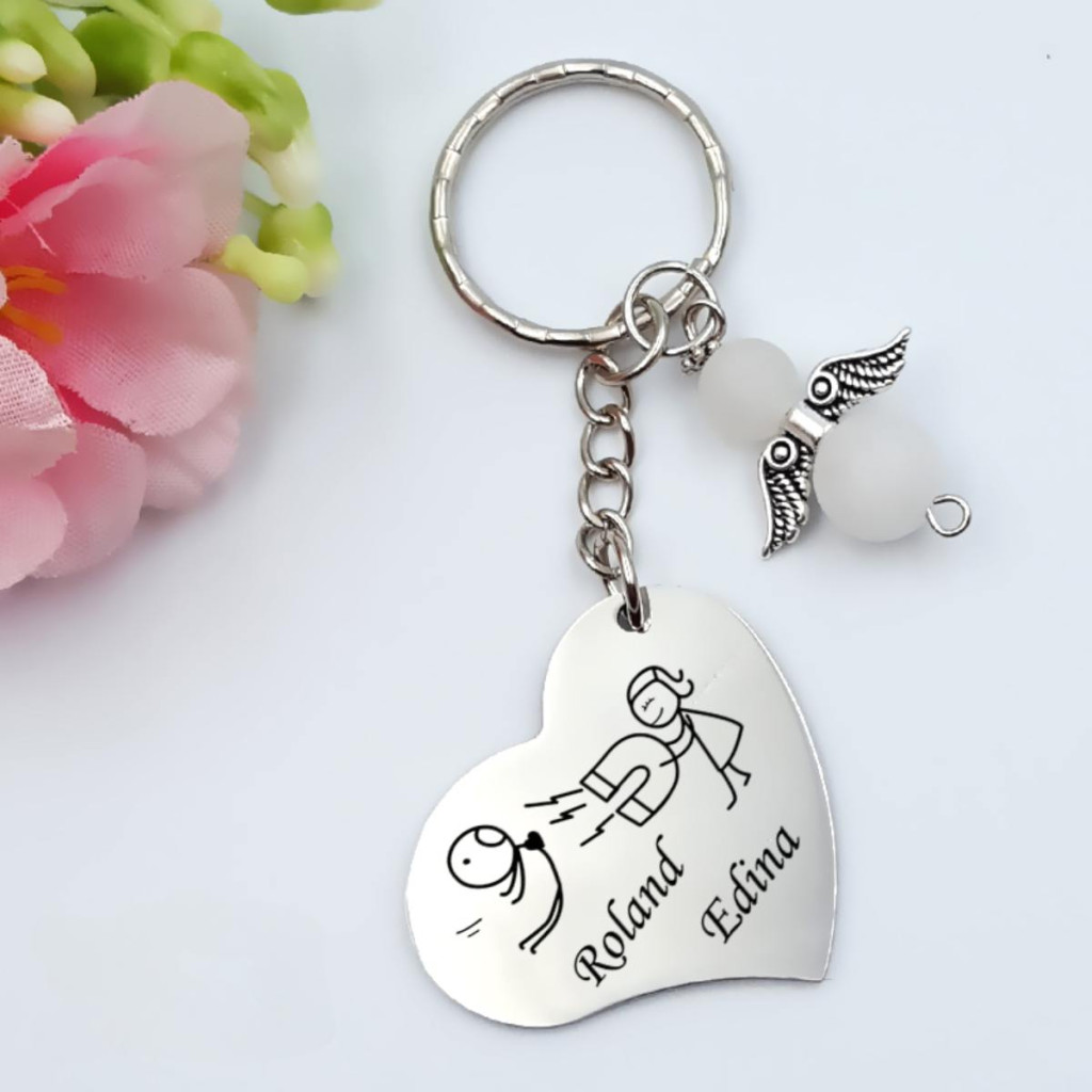 Személyre szabott szív kulcstartó szerelmeseknek, egyedi nevekkel és választható angyaldísszel. Különleges ajándék évfordulóra, Valentin-napra vagy eljegyzésre, amely mindig veletek lehet.