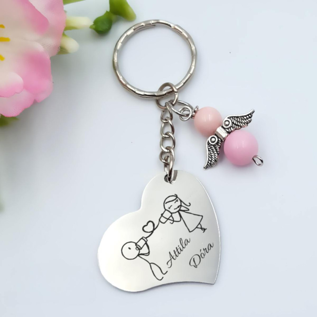 Szív kulcstartó szerelmeseknek – Egyedi gravírozással és választható angyaldísszel