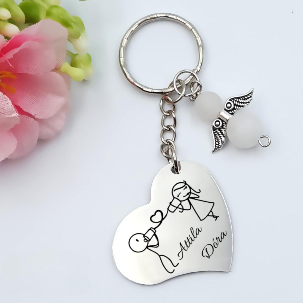 Személyre szabott szív kulcstartó szerelmeseknek, egyedi nevekkel és választható angyaldísszel. Egy romantikus ajándék, amely örök emlék marad évfordulóra, Valentin-napra vagy eljegyzésre.