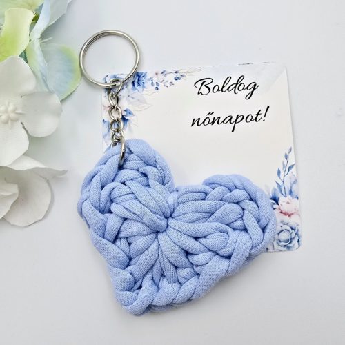 Nőnapi ajándék világos kék horgolt szív kulcstartó ajándékkártyával