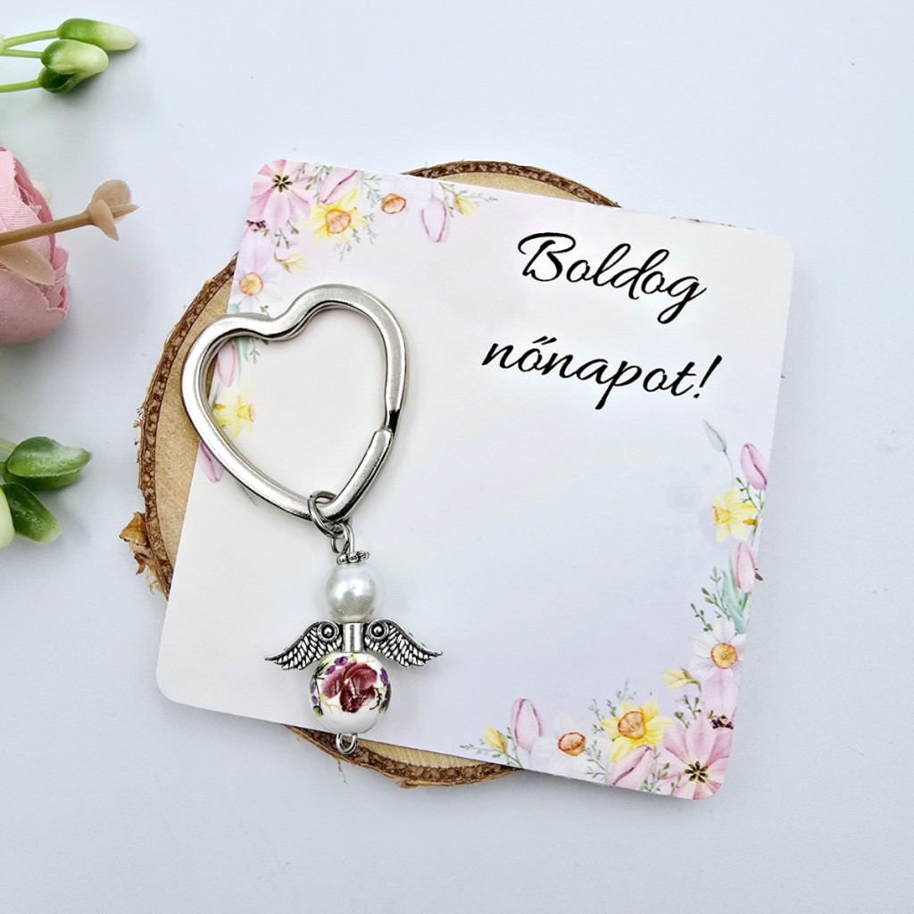 Nőnapi ajándék virágmintás porcelán angyalka kulcstartó ajándékkártyával