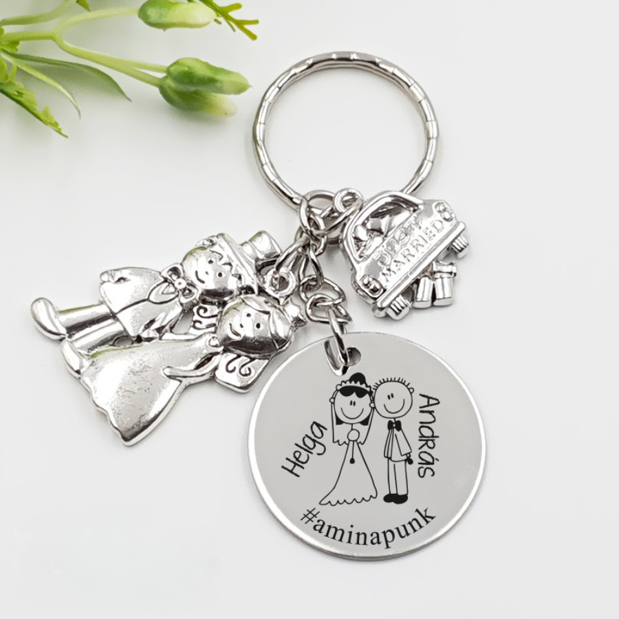 Ajándék esküvőre - kulcstartó grafikával, egyedi névvel, felirattal