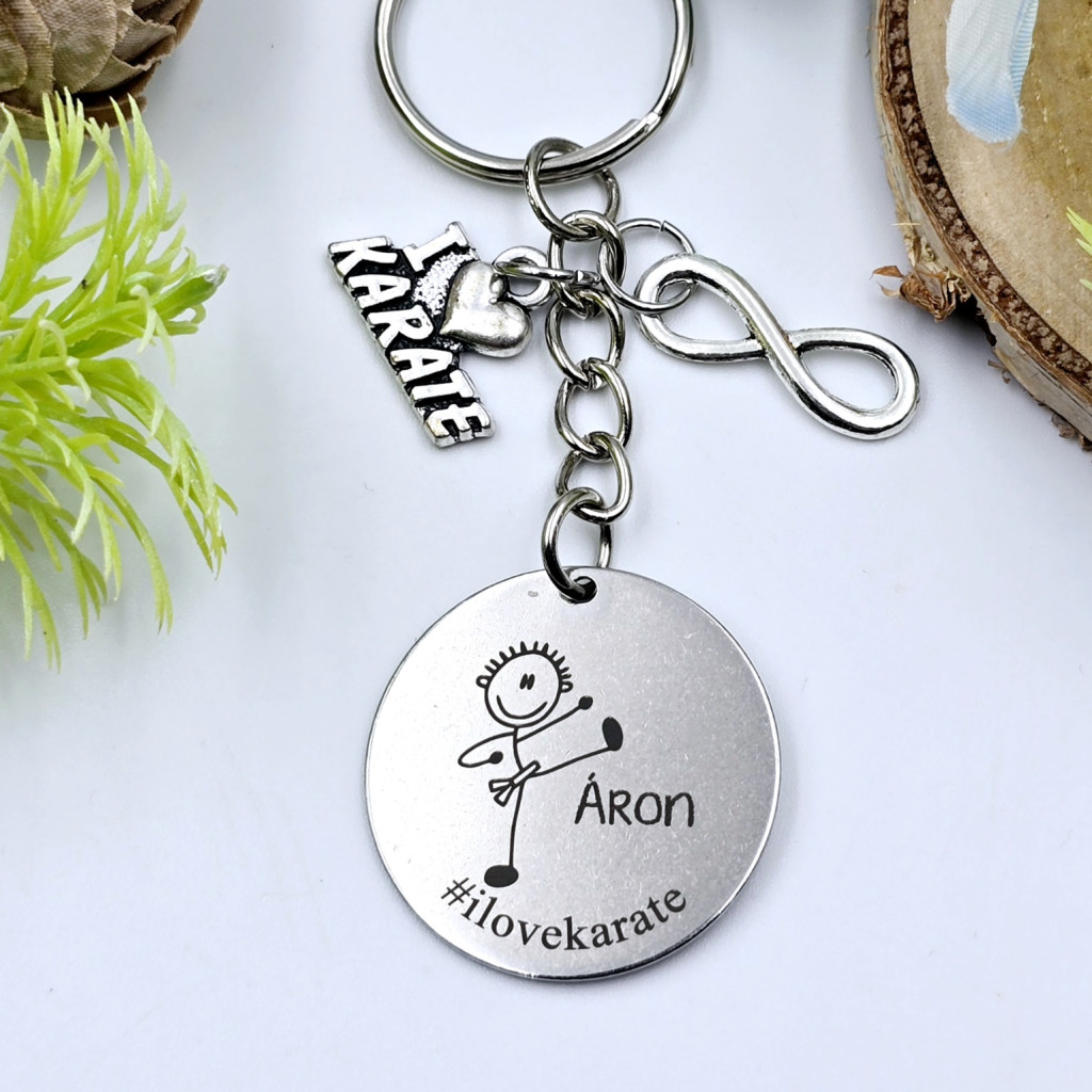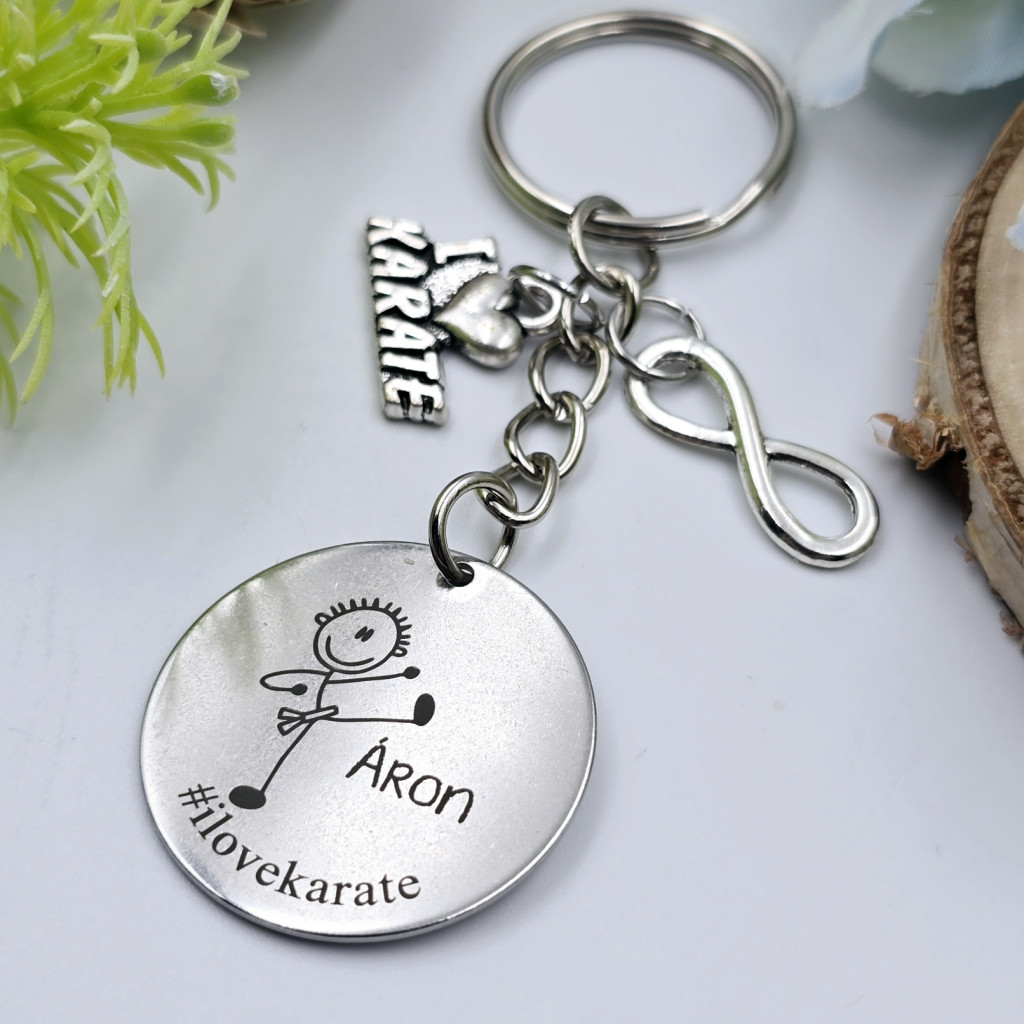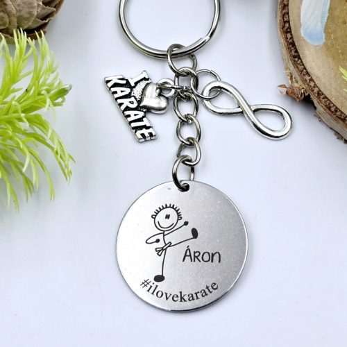 Egyedi névvel kérhető gravírozott kulcstartó,  tökéletes ajándék minden karatésnak.