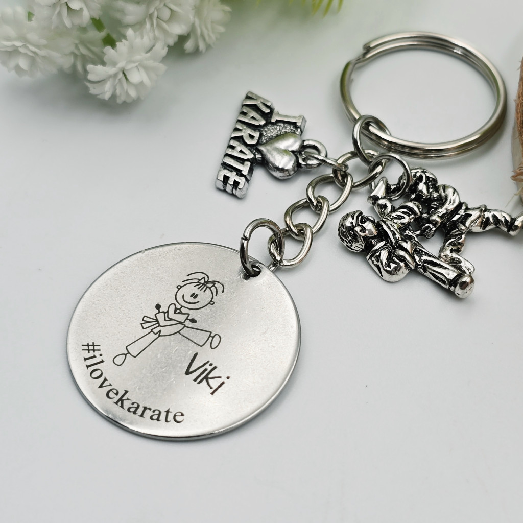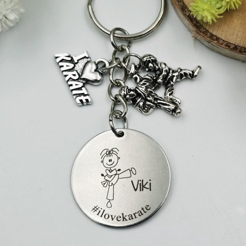 Egyedi gravírozott kulcstartó karatés lányoknak.