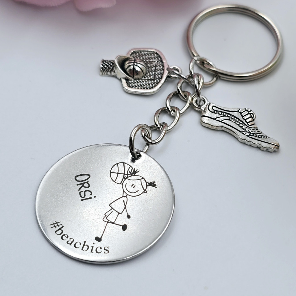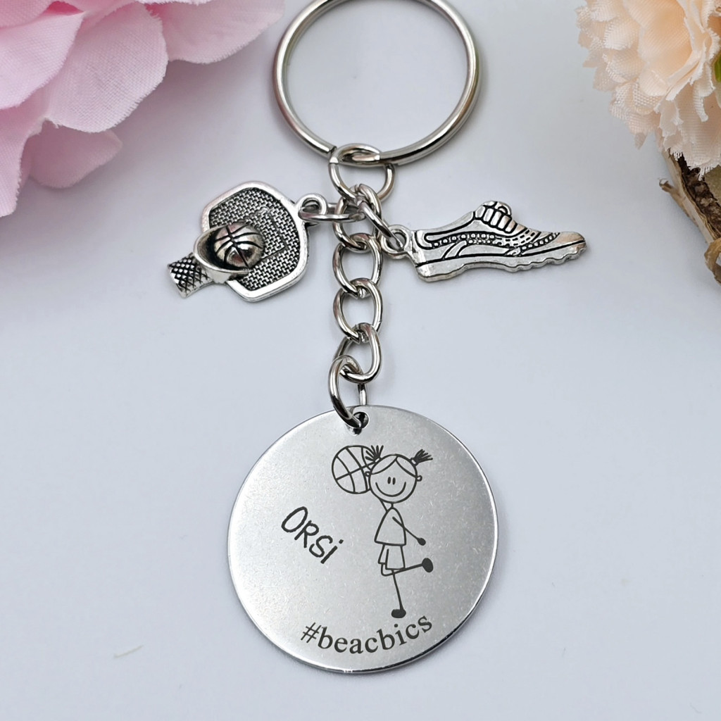 Ajándék női kosárlabdázónak - kosaras kulcstartó grafikával, egyedi névvel, felirattal